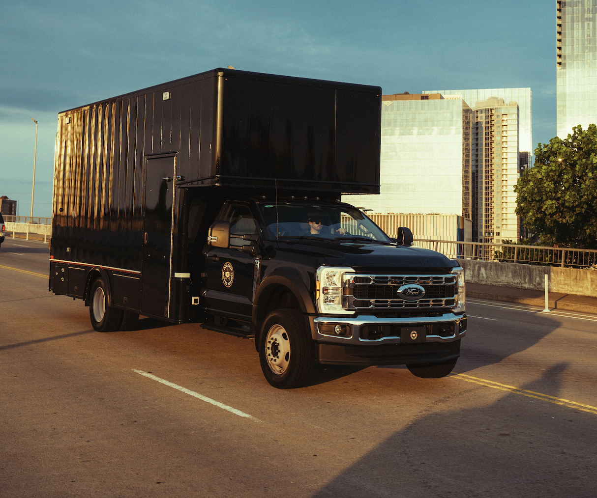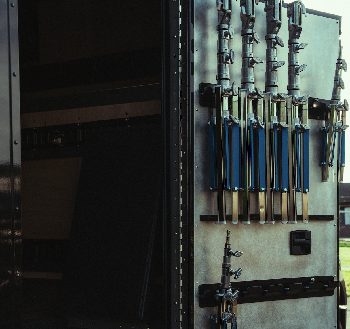Custom-built box with e-track, hardwood flooring, shelving, roof rack, ladders, retractable awning, jockey boxes, and additional interior/exterior lighting