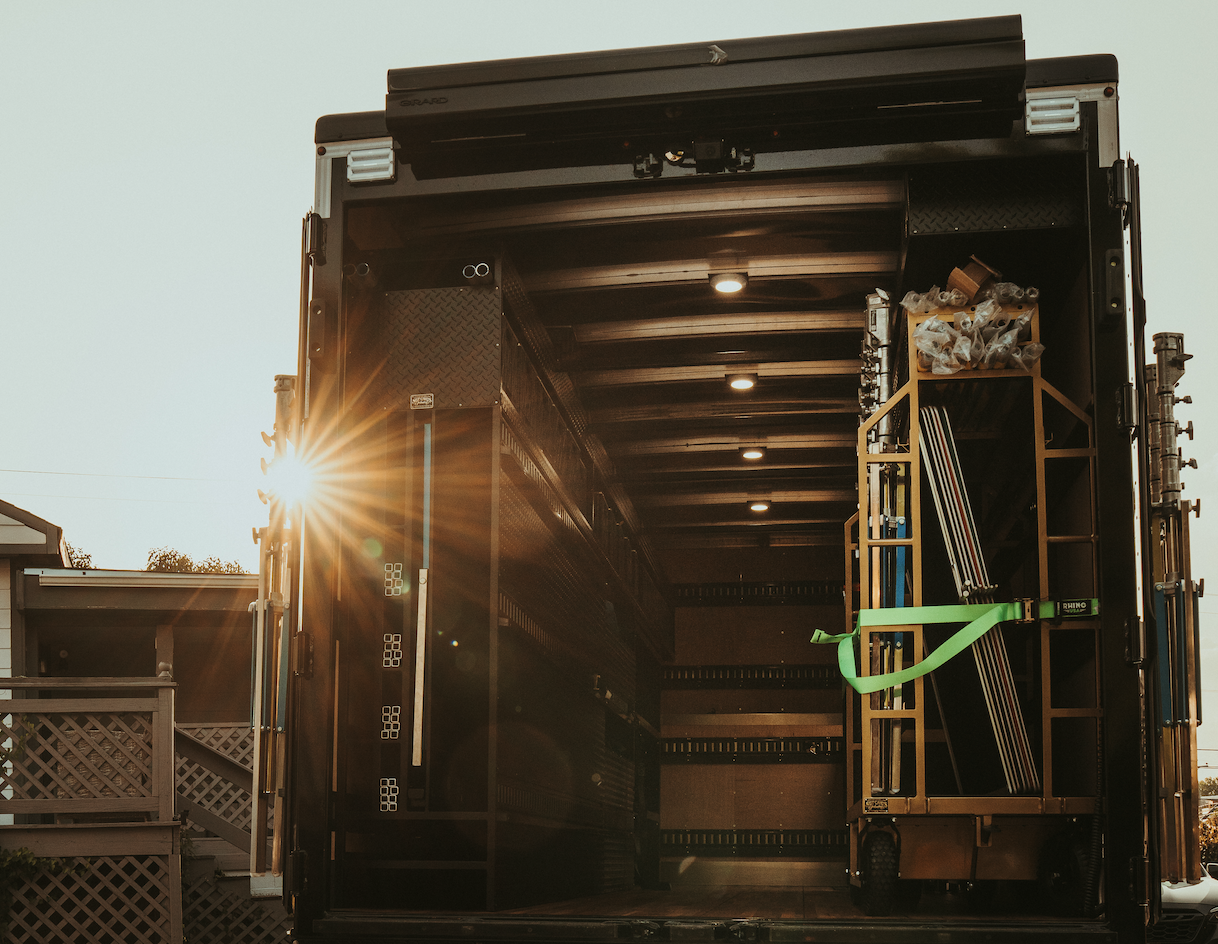 Custom-built interior with partition, e-track, hardwood flooring, shelving, roof rack, ladder, and additional interior/exterior lighting